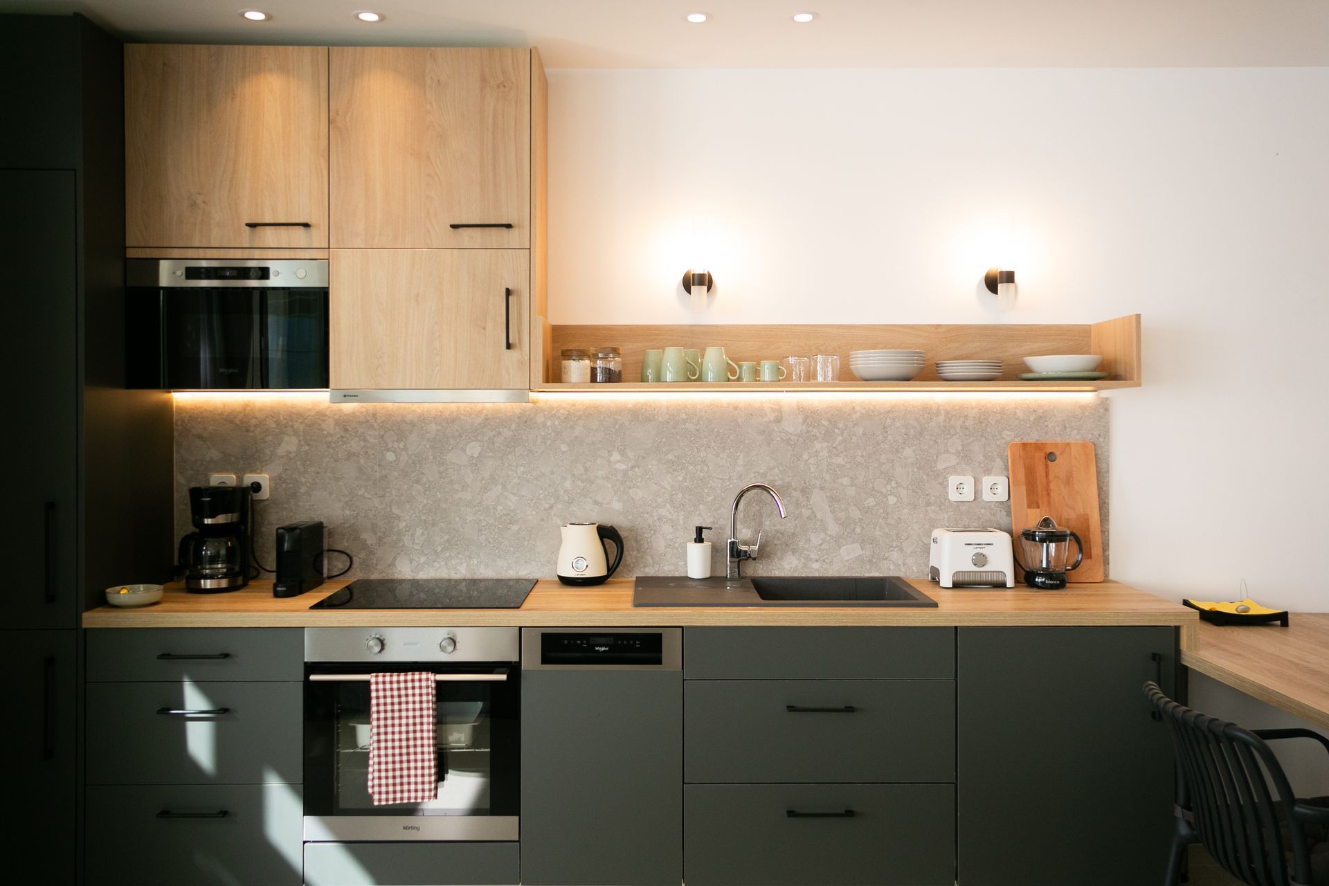 - Coffee machine for filter and espresso coffee, kettle oven, big fridge, dishwasher, washing machine for clothes, microwave