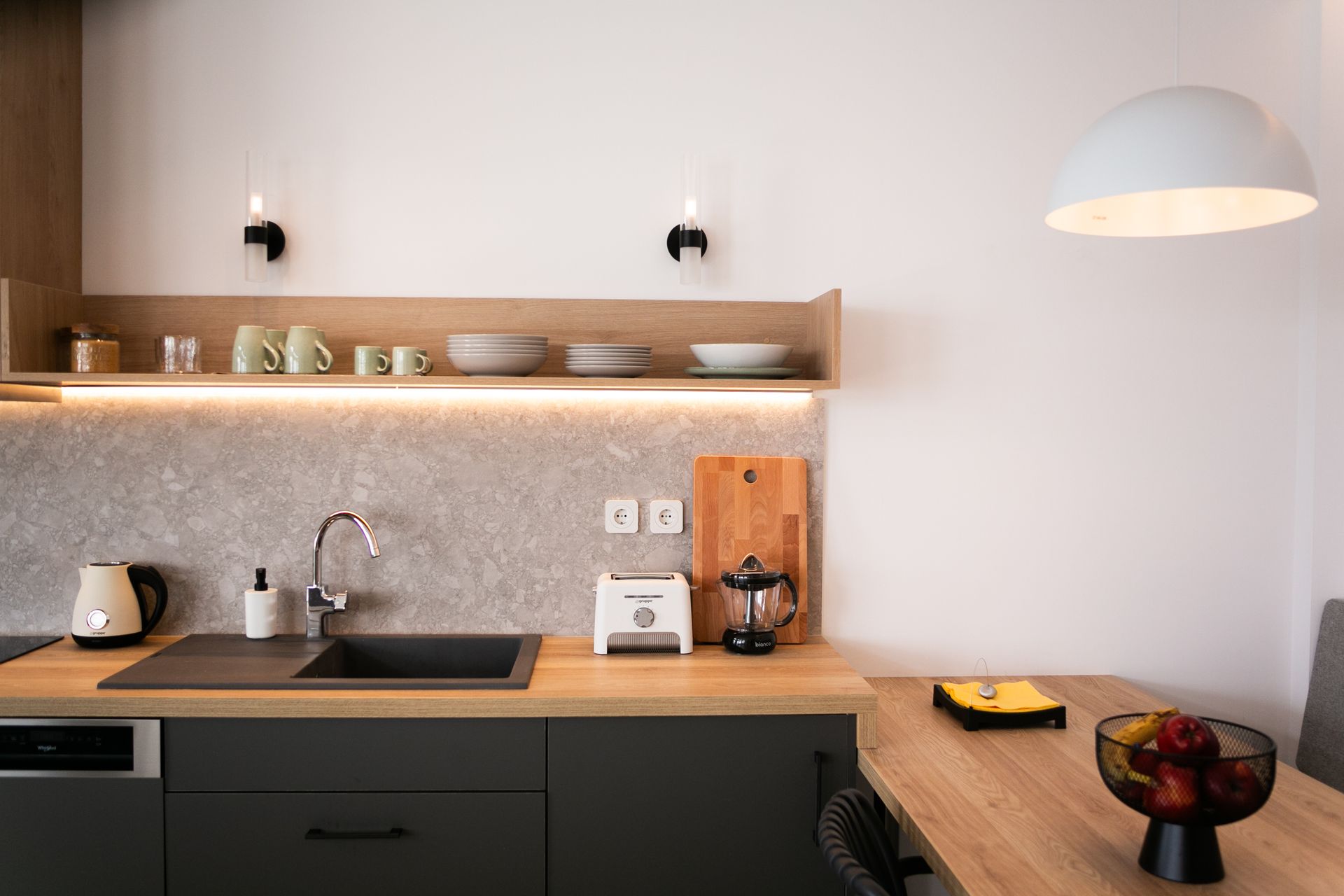 - Fully equipped kitchen Kitchen Utensils , (cutlery, glasses, dishes e.tc.) cooking set, pan,pots, micro electric devices, such as toaster, Lemon Orange Squeezer, blender